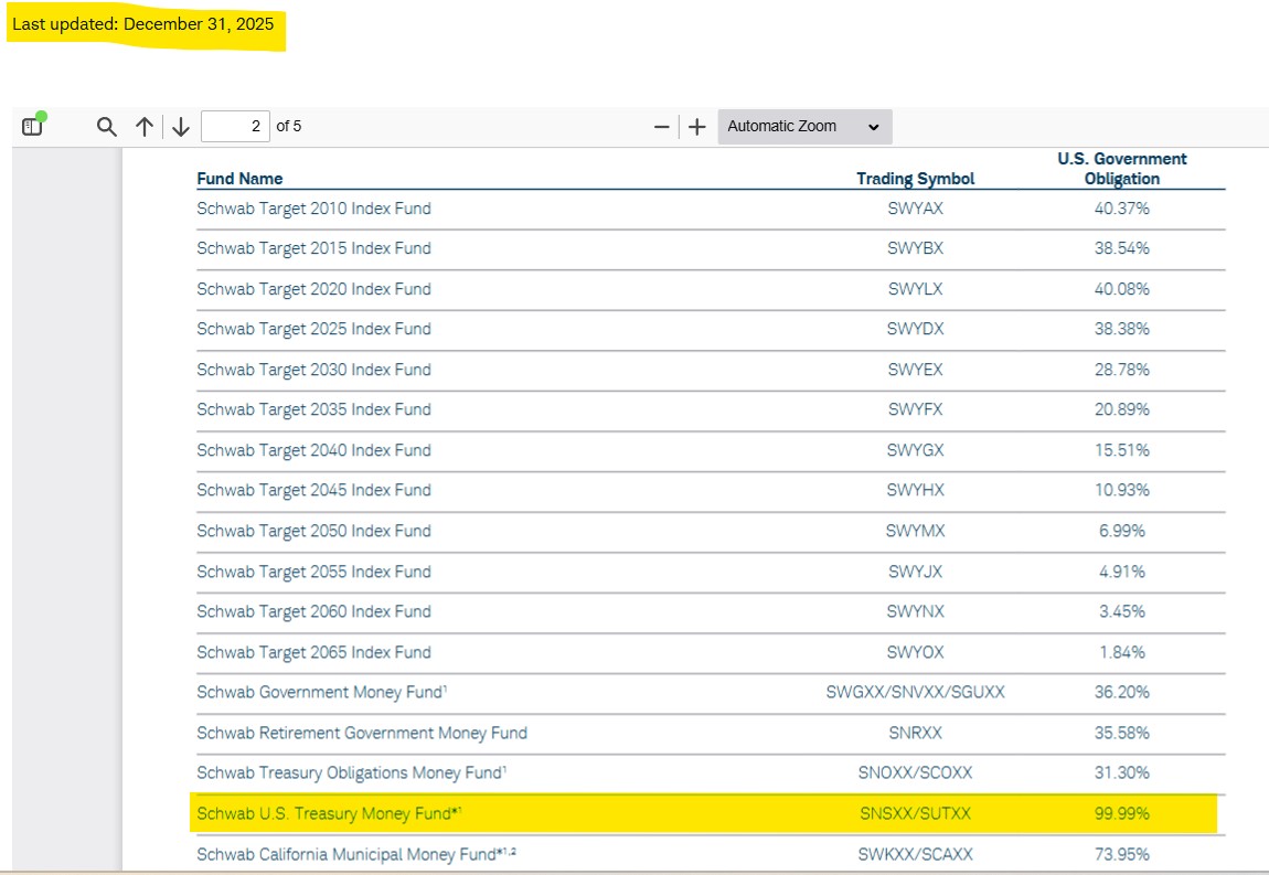 Each Year Charles Schwab issues a Supplementary Tax Guide Showing the various funds in its proprietary fund stack that derive at least some portion of their dividend income from treasuries. The 2025 guide was just released. Here is a link –